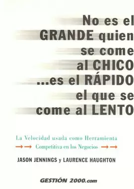 Los consultores Jasón Jennings y Laurence Haughton revelan cómo las empresas de mayor éxito del planeta han llegado a la cabeza de su sector y han sabido mantenerse siempre un paso por delante de sus competidores. "No es el grande el que se come al chico es el rápido el que se come al lento" contiene todos los secretos y las tácticas usadas para alcanzar un gran éxito en el sector elegido a una velocidad de vértigo. De esta forma usted aprenderá a: Pensar con rapidez previendo y detectando tendencias Tomar decisiones rápidas aplicando reglas y valorando estrategias Salir al mercado con rapidez explotando sus ventajas e institucionalizando la innovación Seguir siendo rápido permaneciendo flexible y en contacto cercano con el cliente. Jennings y Haughton ha recorrido el mundo y han penetrado hasta el corazón de las empresas más rápidas para conocer y aprender los métodos que usan en sectores que van desde la venta al por menor a la comida rápida, de los servicios financieros hasta la comunicación.