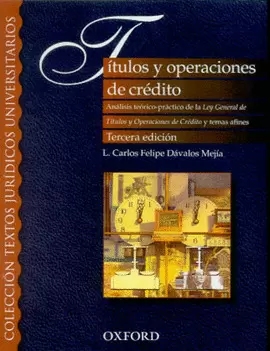 La Ley General de Títulos y Operaciones de Crédito es uno de los más formidables troncos académicos, doctriles, profesioles y judiciales del derecho mercantil mexicano. En dichos ámbitos, su recurso es tan obligado como frecuente. Esta célebre ley está dividida en dos títulos. El primero se reserva a los títulos de crédito (letra de cambio, cheque, pagaré, etc.) y el segundo a las operaciones de crédito, que desde su perspectiva persol el autor califica como contratos (apertura de crédito, fideicomiso, crédito documentario, etc). Se trata, cabalmente, de dos leyes en u. En este libro, dirigido en especial al estudiante, se aliza en forma sistemática y exhaustiva todo el contenido de los dos títulos de dicho cuerpo normativo, incluidas las modificaciones de mayo de 2000 que en conjunto se denomiron Miscelánea de garantías del crédito, en torno a la prenda sin transmisión de posesión y el nuevo fideicomiso de garantía. Cada uno de los títulos, contratos e hipótesis que la ley contempla, así como los temas que les son afines como la acción societaria, el juicio ejecutivo, la unificación cambiaria interciol, el nuevo juicio de ejecución de prenda y fideicomiso y otros, son objeto de un minucioso estudio que metodológicamente se inicia en la exploración histórica de cada tema, continúa con su explicación tanto lógica como técnica -ambas de particular importancia para el autor- y termi con u exposición práctica que se centra tanto en los problemas que dichos temas suelen plantear en la realidad como en las precauciones que pueden tomarse para evitarlos, lo que se refleja con claridad en la cita de alrededor de 900 precedentes y jurisprudencias federales que están ubicados de manera oportu como comentarios directos sobre un mismo número de casos concretos alizados en el texto. La experiencia de Dávalos por más de 20 años en tribules, aulas y negocios mercantiles se ve sin duda reflejada en esta obra, que durante ese tiempo ha estado preparando con el propósito fundamental de enseñar la materia. Los gráficos que en ella aparecen, tal cual los utiliza el autor en el pizarrón de su clase, configuran un apoyo gráfico que en efecto cumple con un principio didáctico especialmente útil en ciertos temas.